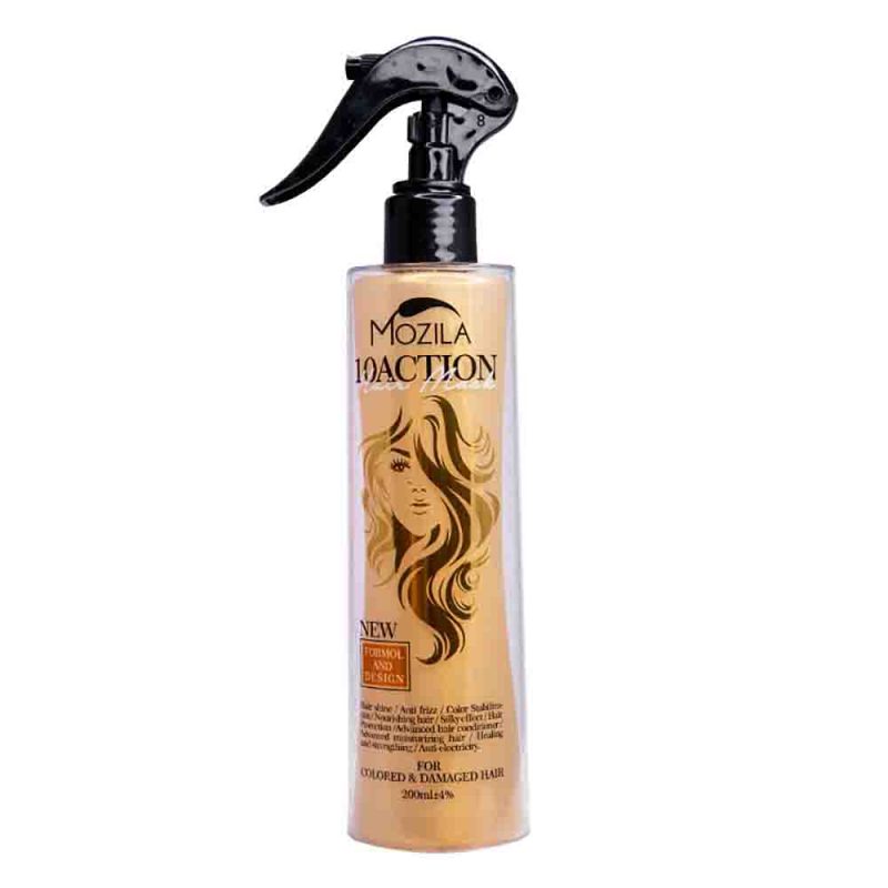 اسپری ماسک مو بدون نیاز به آبکشی 10 کاره 10Action موزیلا یک محصول با 10 عملکرد تقویت کننده مو است که ضمن برطرف کردن وز،خشکی و زبری و شکنندگی مو،ظاهری براق و درخشان به موهایتان میدهد. این محصول به دلیل داشتن روغن آرگان آبرسان و مغذی بوده و موهای خشک و آسیب دیده را ترمیم میکند.