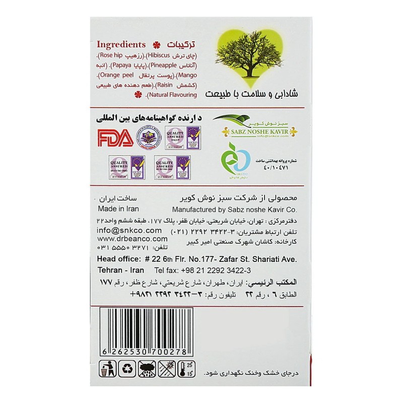 - ترکیبی خاص از میوه های رزهیپ ، پاپایا ، آناناس ، پوست پرتقال ، انبه ، کشمش و چای ترش