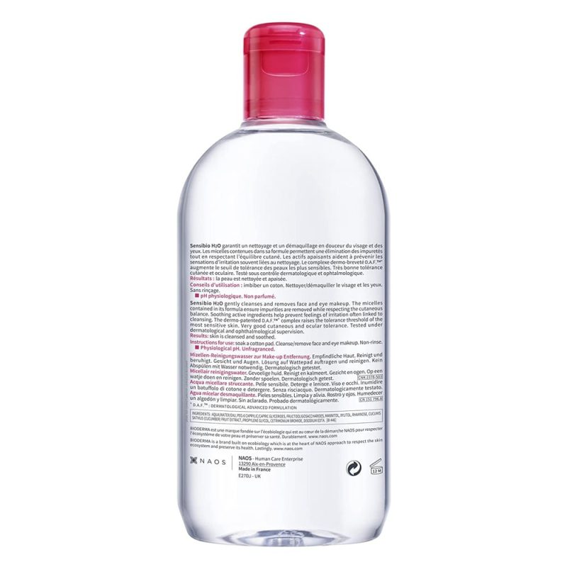 گروه محصولات بایودرما سنسیبیو بطور تخصصی برای افراد با پوست حساس فرموله شده است. میسلار واتر این گروه نیز همه انواع آلودگی ها و مواد آرایشی را از سطح پوست پاکسازی کرده و با احترام به محیط میکروبیوم طبیعی پوست، واکنش های حساسیتی را کنترل کرده و یک تسکین دهنده قوی التهابات نیز می باشد. میسلارواتر بایودرما بطور همزمان برای پاک کردن آرایش چشم و صورت بکار می رود و بافت غیرچرب و غیر چسبنده داشته که با استفاده از یک پد پنبه ای، پوست صورت را بطور کامل تمیز می کند. در تولید این محصول تنها از 10 ماده اولیه استفاده شده است و تا 99% مواد آرایشی را از سطح پوست پاک می کند. آلودگی های محیطی، گرد و خاک و فلزات سنگین هم با استفاده از این محصول از پوست جدا می شوند. این میسلارواتر با استفاده از فناوری انحصاری DAFTM حساسیت های پوستی را تا 79% کاهش داده و میزان تحمل پوست را افزایش میدهد. در ترکیبات این آرایش پاک کن از عصاره خیار ، اولیگوساخارید ها و رامنوز بهمراه آمینواسیدها استفاده شده است و پس از استفاده نیازی به آبکشی ندارد.