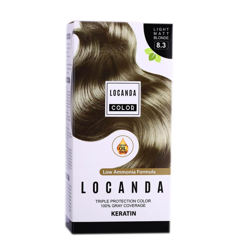 کیت رنگ مو کراتینه لوکاندا شماره 8.3 رنگ بلوند زیتونی روشن حجم 50 میلLocanda Keratin Low Ammonia Hair Color Kit-50ML